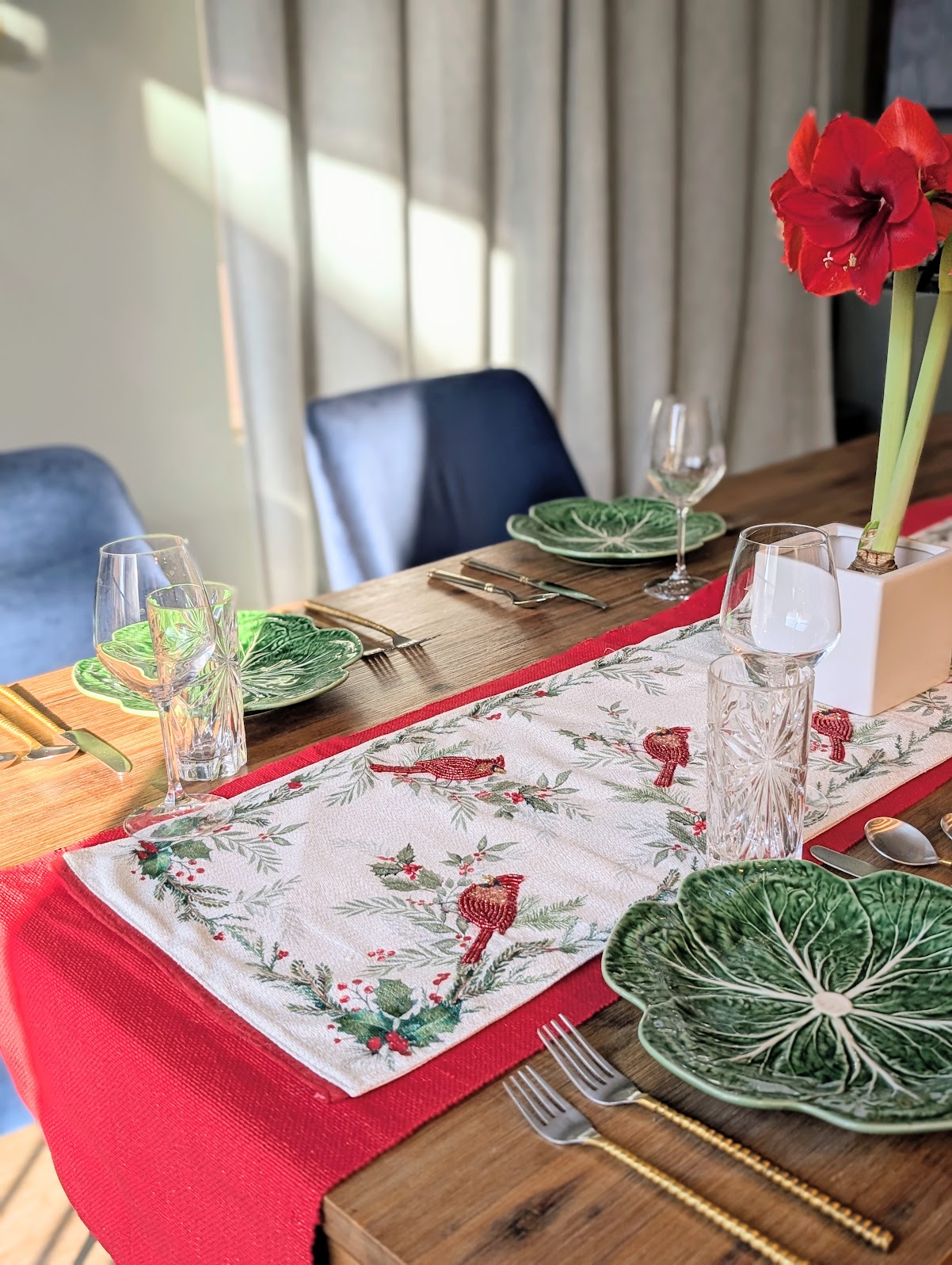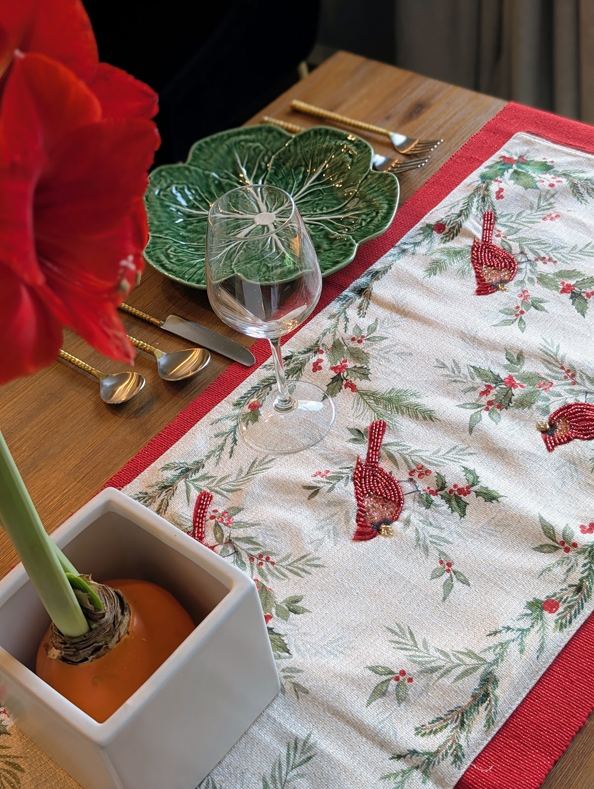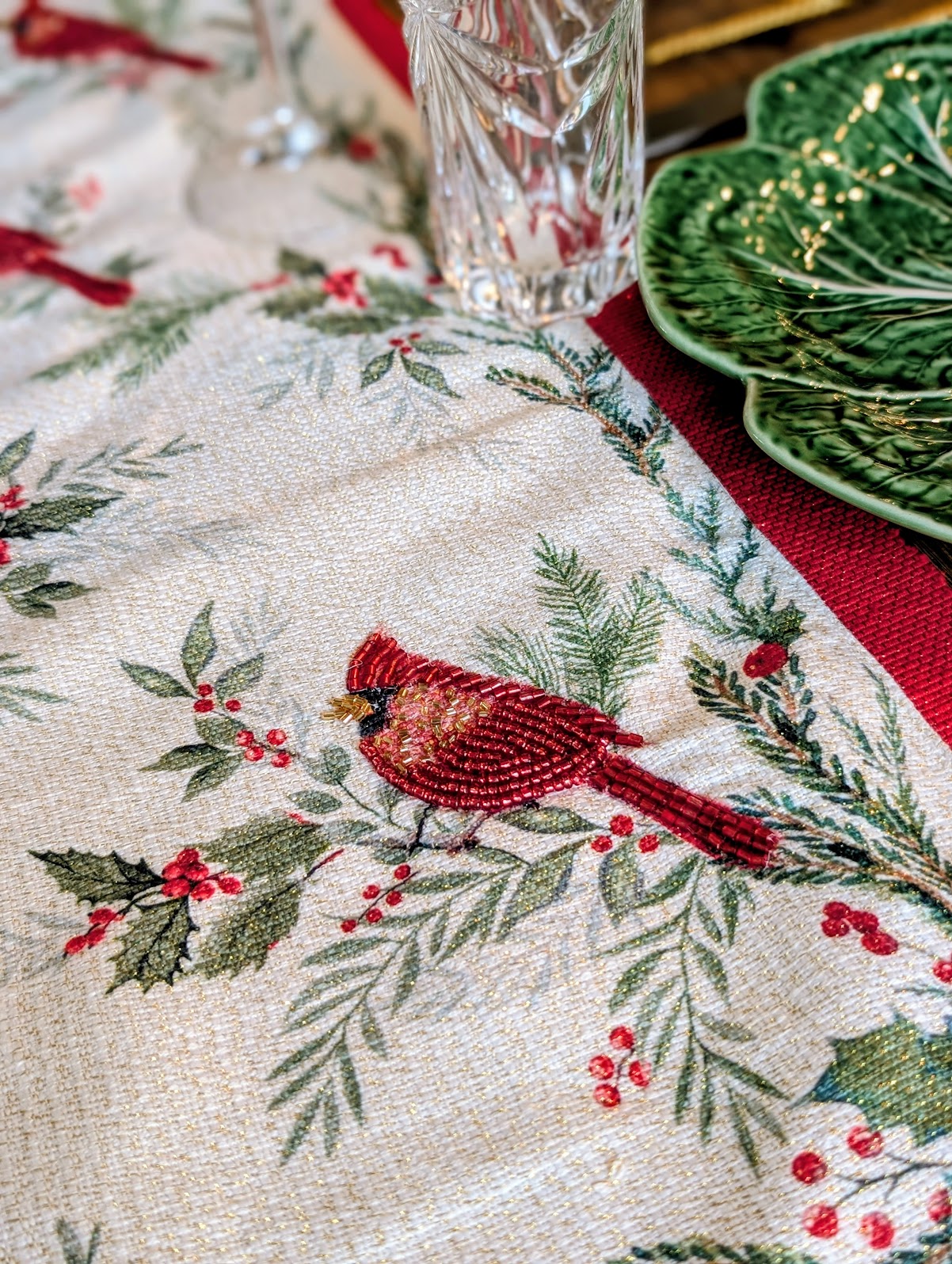 Bộ 2 Table Runner Màu Đỏ Và Hình Cành Thông Quả Đỏ Thêu Chim Cardinal – Hiệu Artisan De Luxe