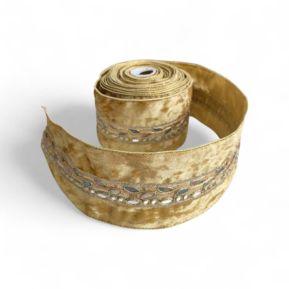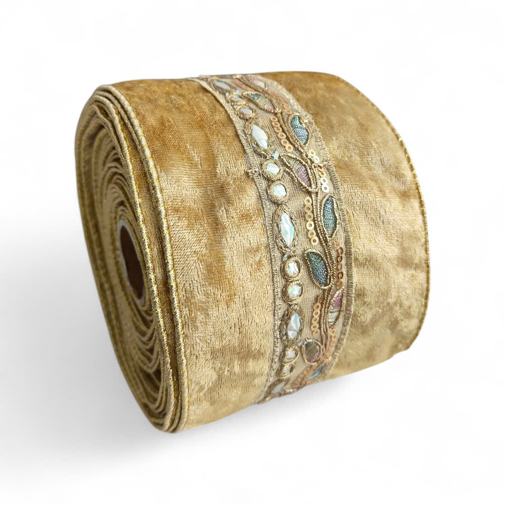 Ribbon nhung vàng có kết hạt và thêu bản 90mm – Cuộn 9m