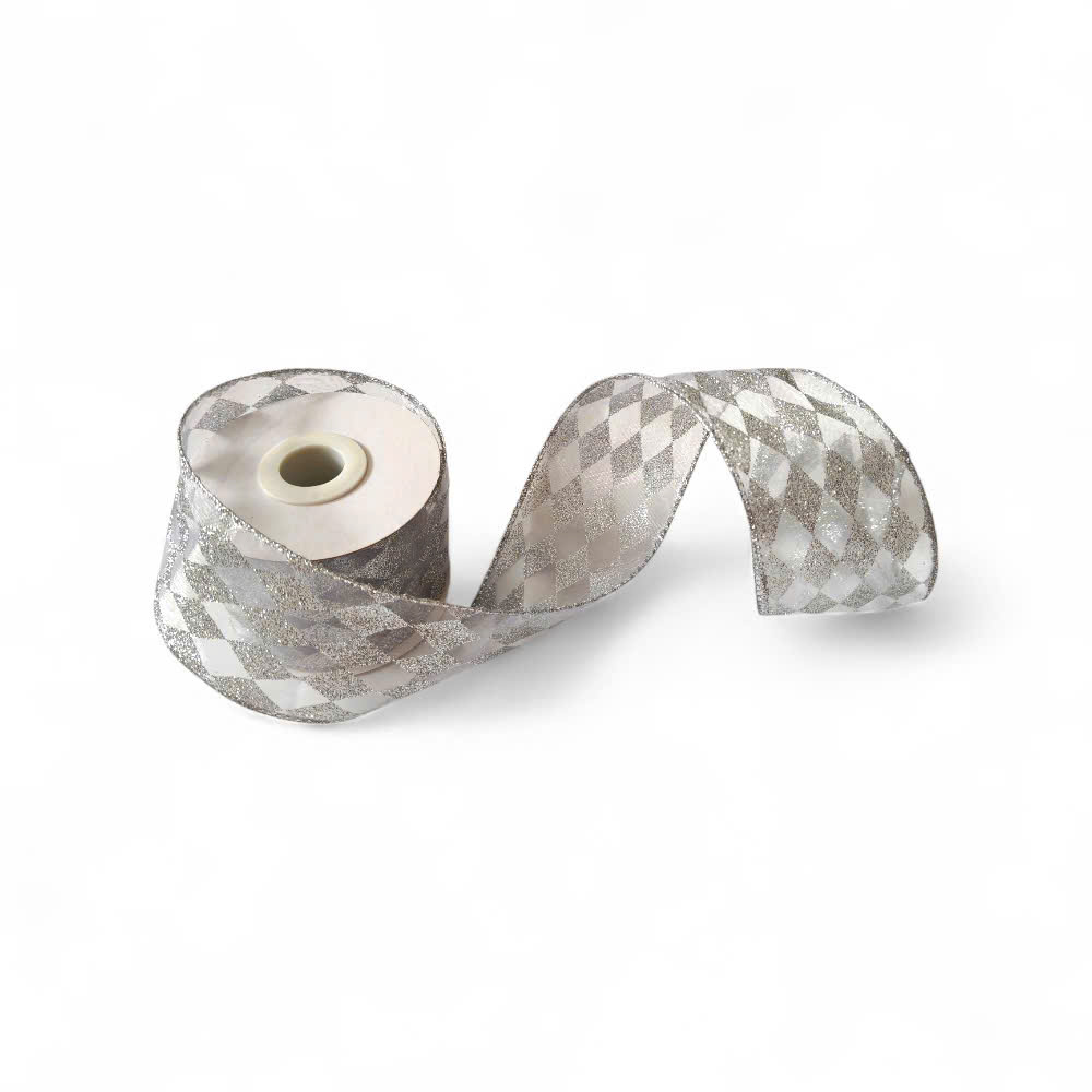 Ribbon Organza trong suốt hoạ tiết Harlequin kim tuyến bạc bản to 63mm - Cuộn 9m - La Maison Chouette